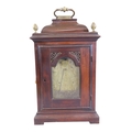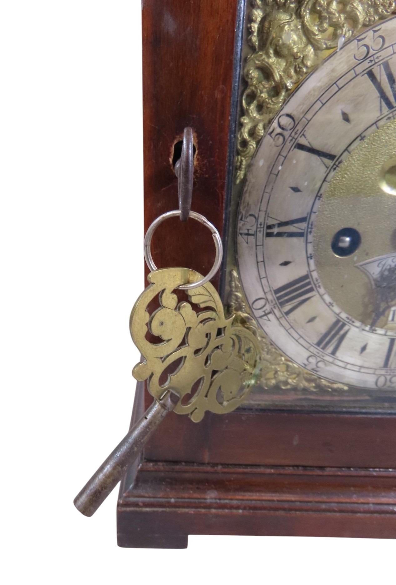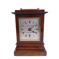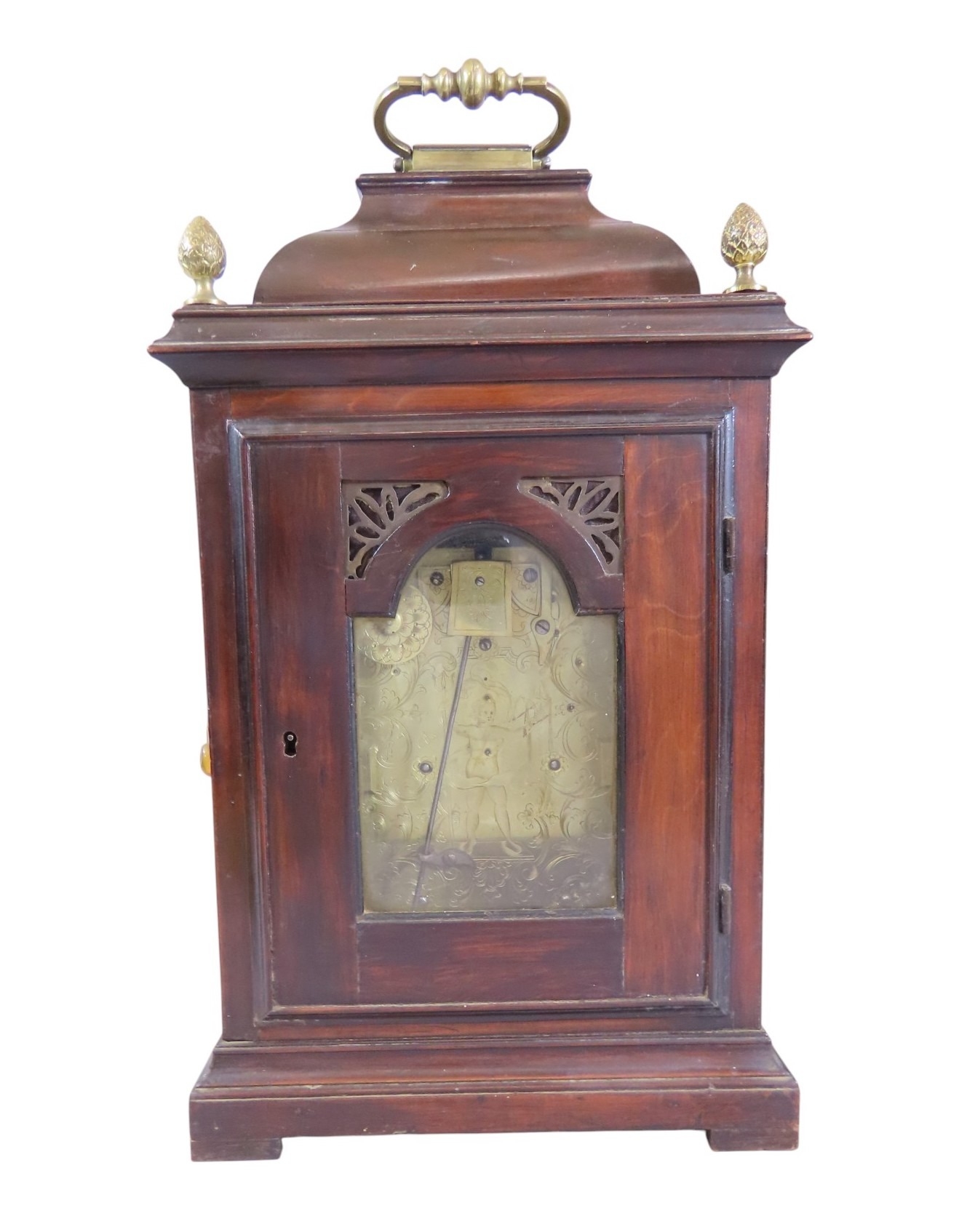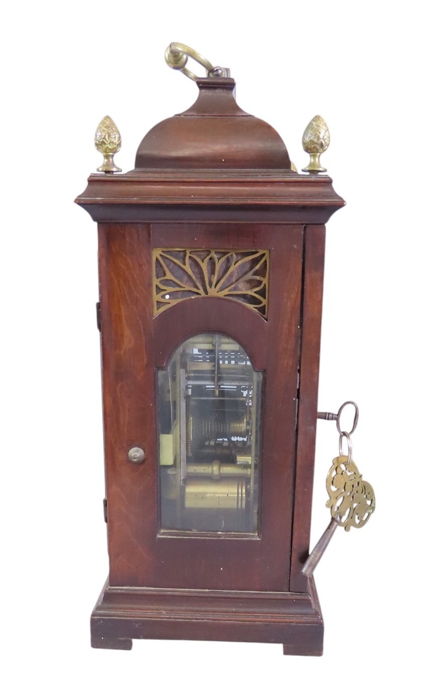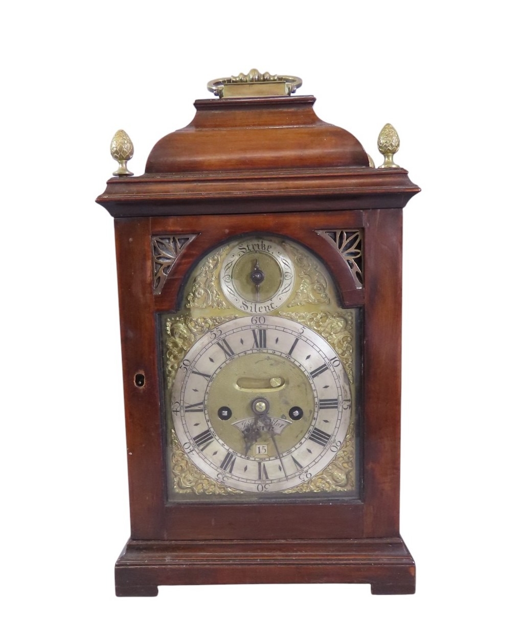 John Taylor of Bath, a fine and scarce 18th century fruitwood cased bracket clock of diminutive proportions, the pad top fitted with brass carrying handle, cornered by gilt metal finials over a 5.5” chapter ring populated with black Roman and Arabic numerals, centred with name plate and day / date aperture, below a subsidiary strike/silent dial, with gilt spandrels and pierced brass fretwork to case, facing a double fusee six bell pull repeating verge movement, the backplate intricately engraved with allegorical scene detailing Neptune with trident and cornucopia, 42cm high (including handle) 23.5 x 16.5cm. Complete with keys and pendulum