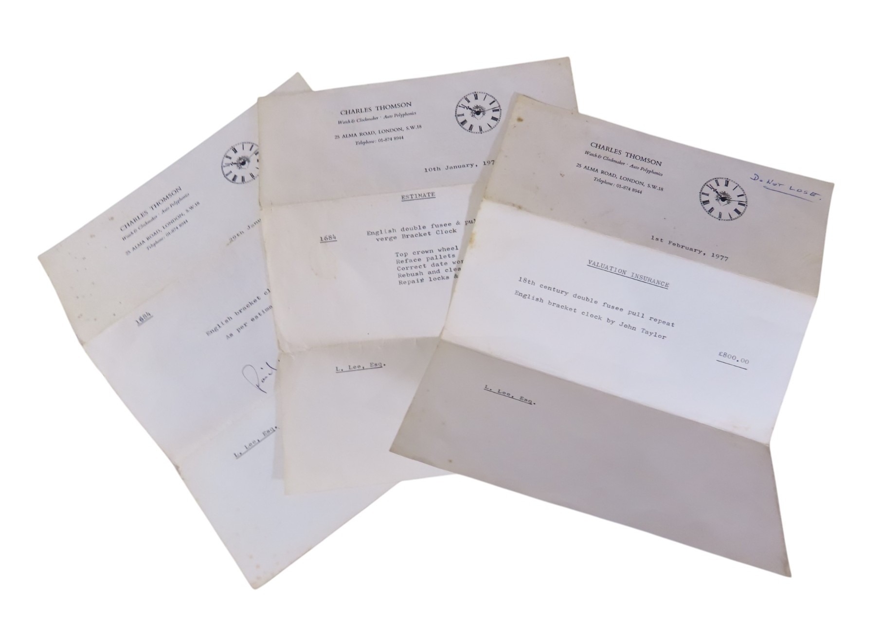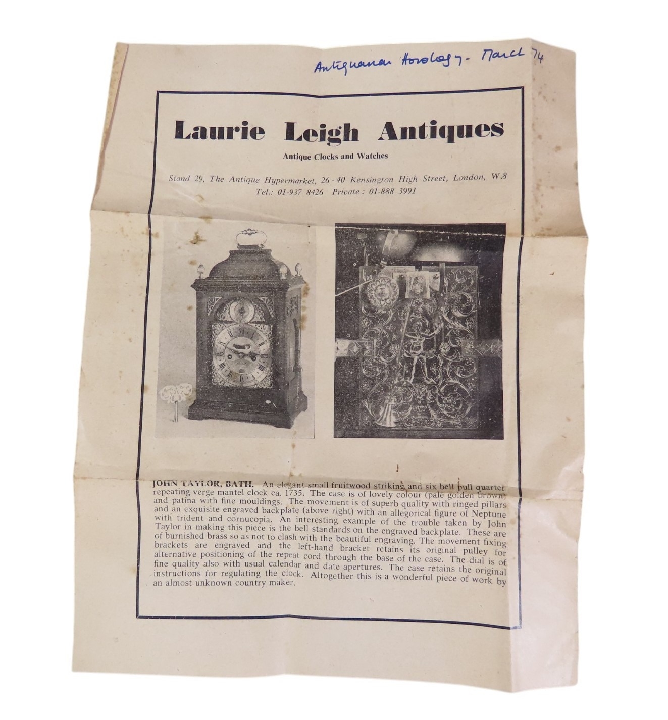 sold with Charles Thomson insurance valuation and repair documents dated January / February 1977 and advertisement for Laurie Leigh Antiques illustrating this timepiece, c1974, in a later associated protective pine case