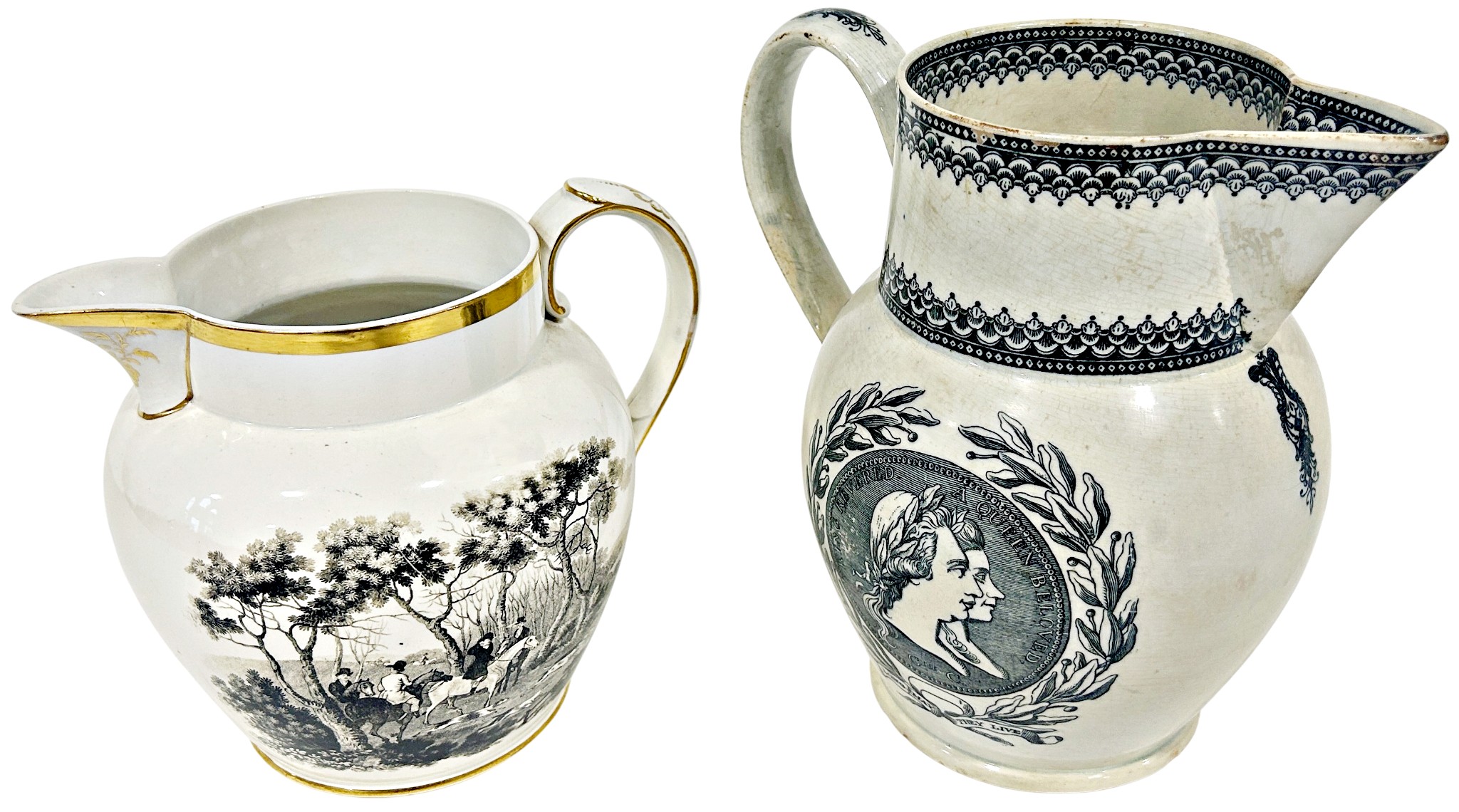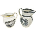 George III (1760-1820) A commemorative transfer printed jug decorated with profiles of the king and Queen Charlotte 'A King Revered, A Queen Beloved, Long May They Live', 20cm high, together with a further transfer-printed jug (2)