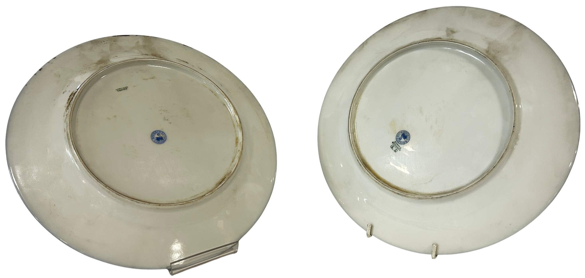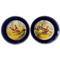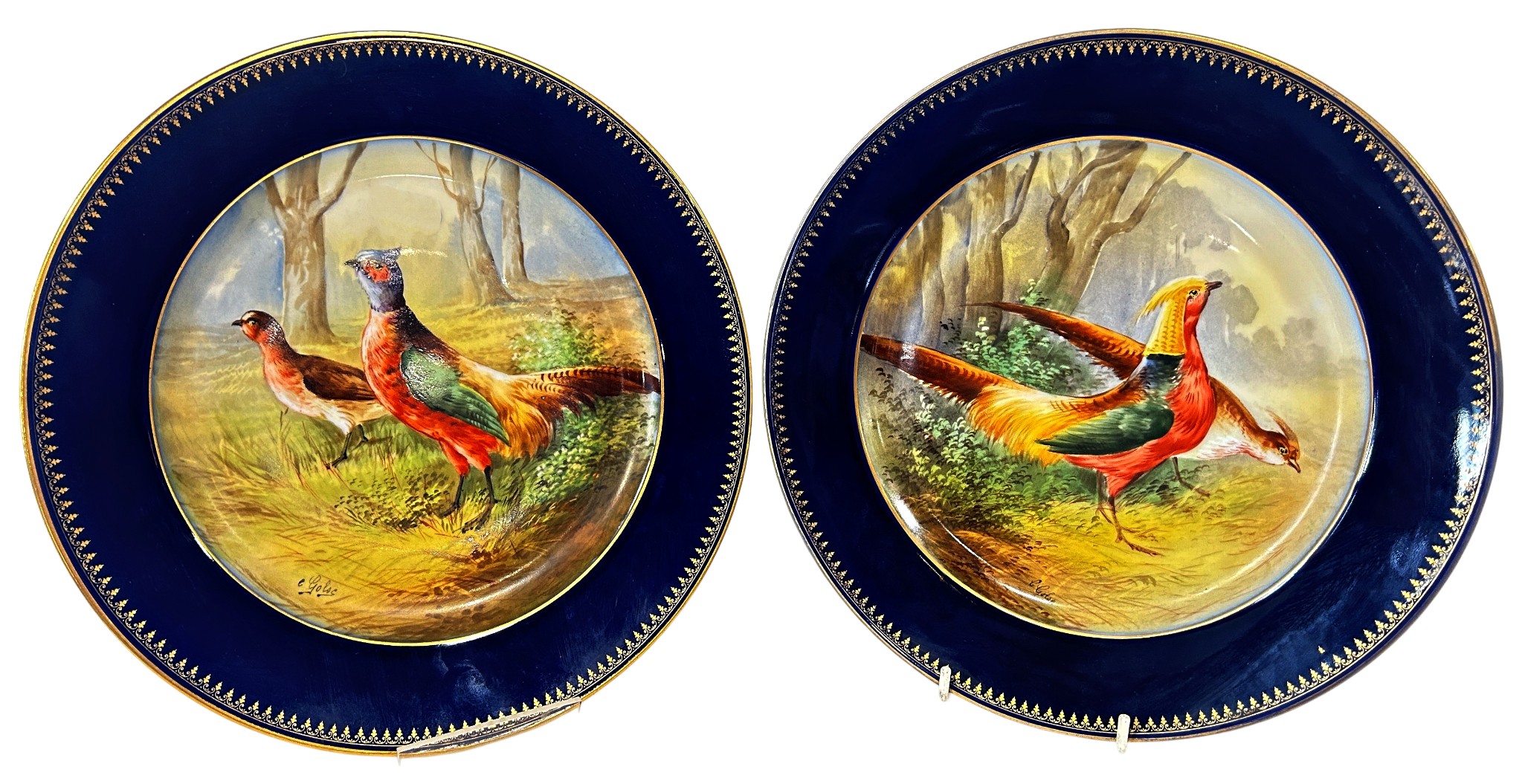 Pair of Limoges decorative plates showing Golden and Common Pheasants, set within blue and gilt borders, signed C. Golas