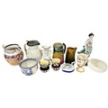 A mixed collection of ceramics to include an allegorical figure with peacock, a bacchanalian cup, small jelly mould, lustre jug, other jugs, etc