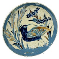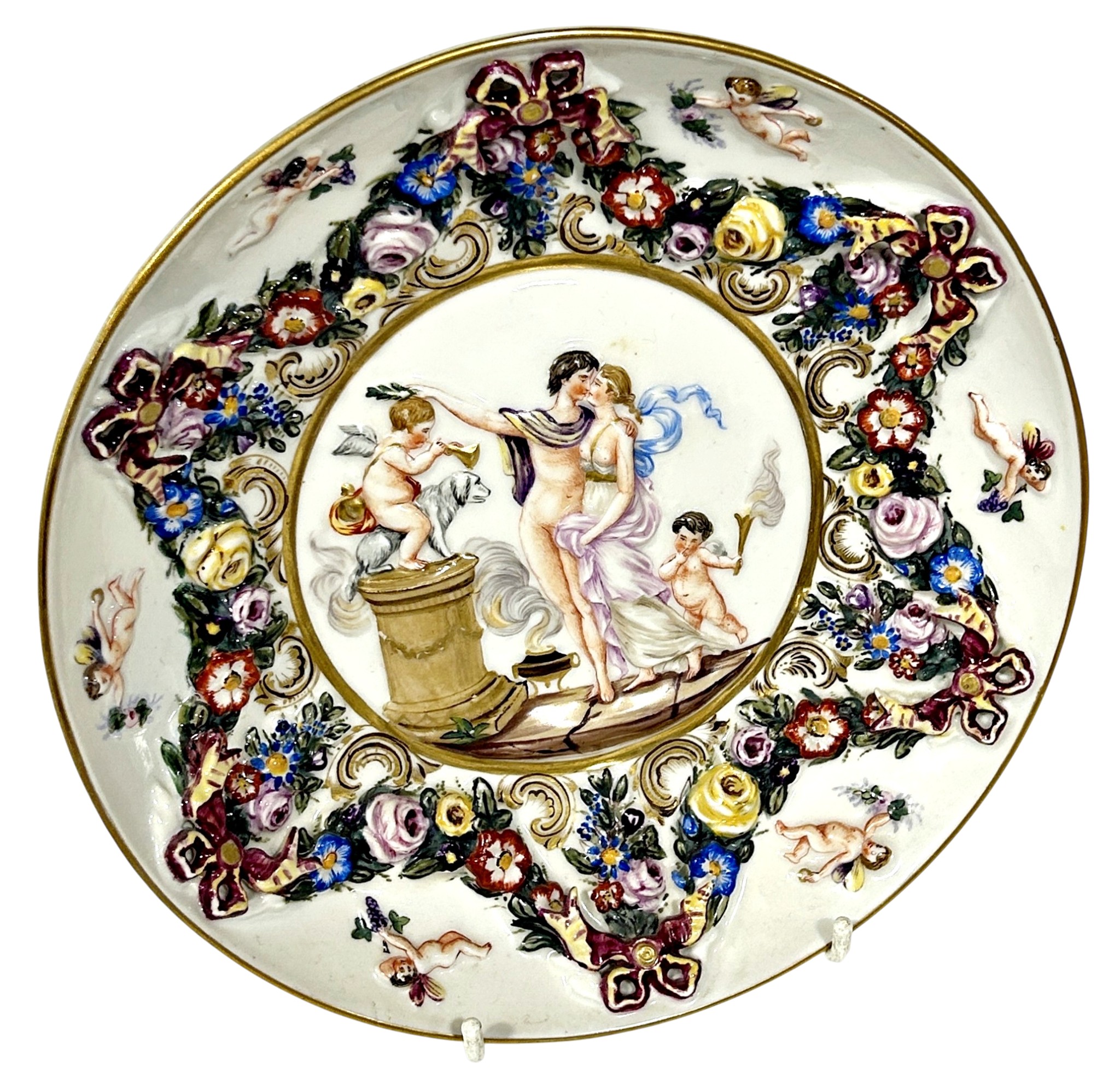 A Capodimonte plate decorated in relief with classical scene within floral bouquets, 23cm diameter