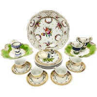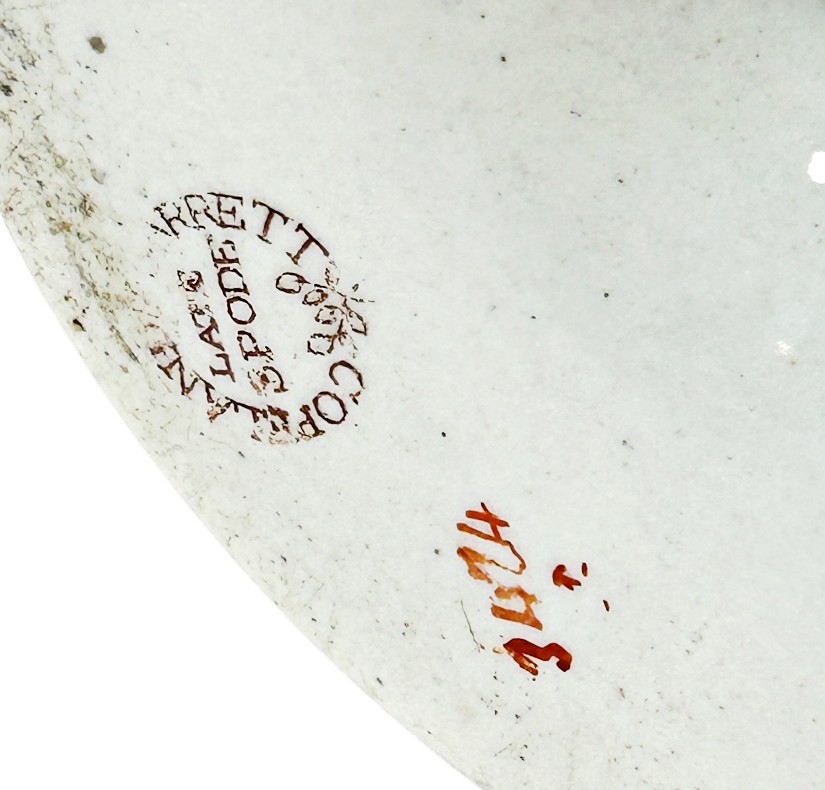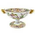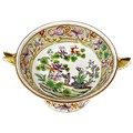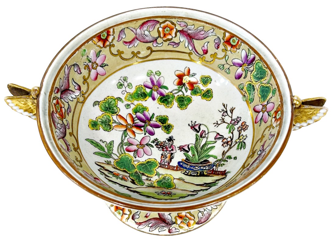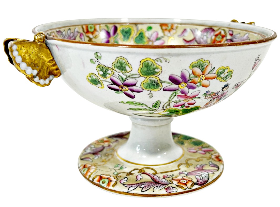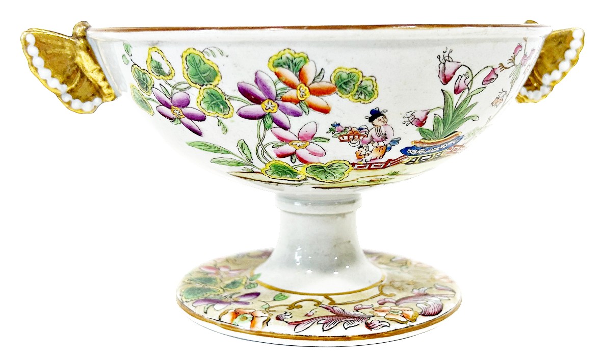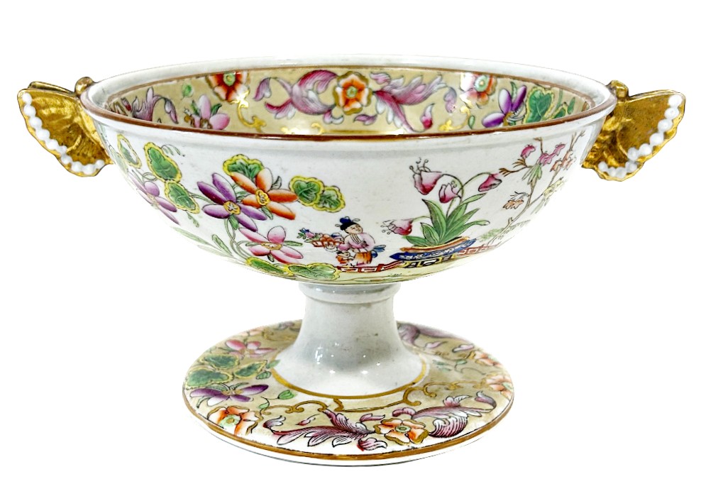 A Copeland & Garrett stem dish with chinoiserie detail and gilded butterfly handles, 20cm diameter