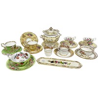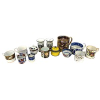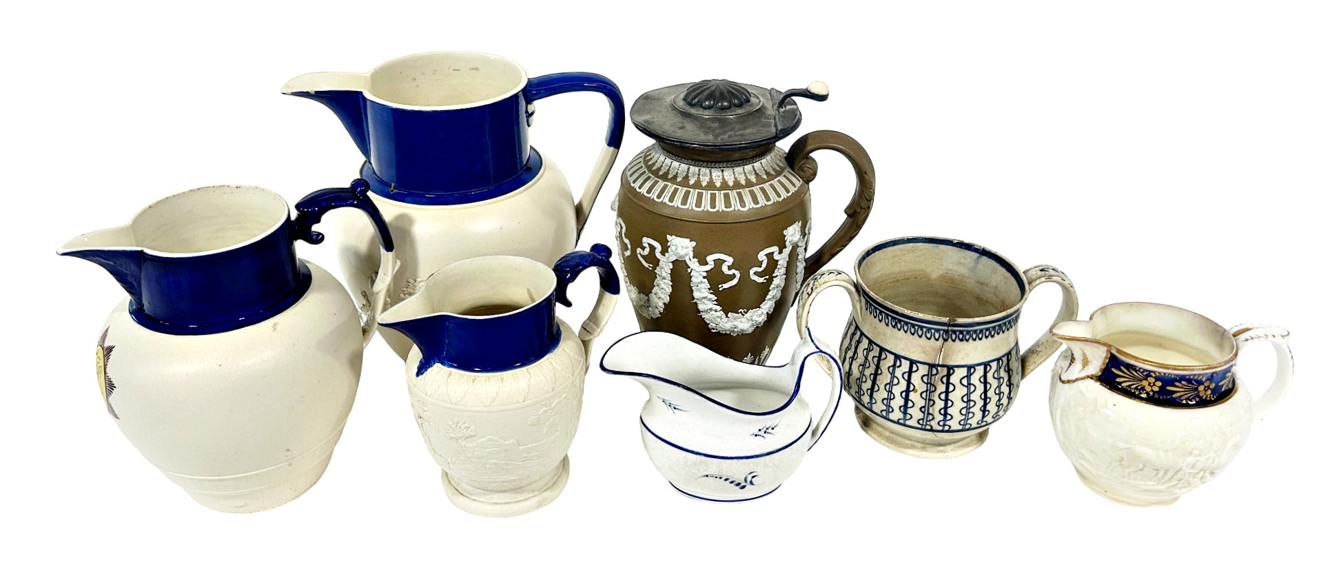 A group of buff glazed 19th century moulded jugs to include hand monogrammed example, further jugs, loving cup, etc