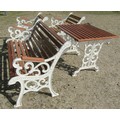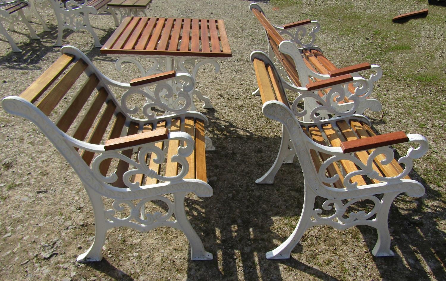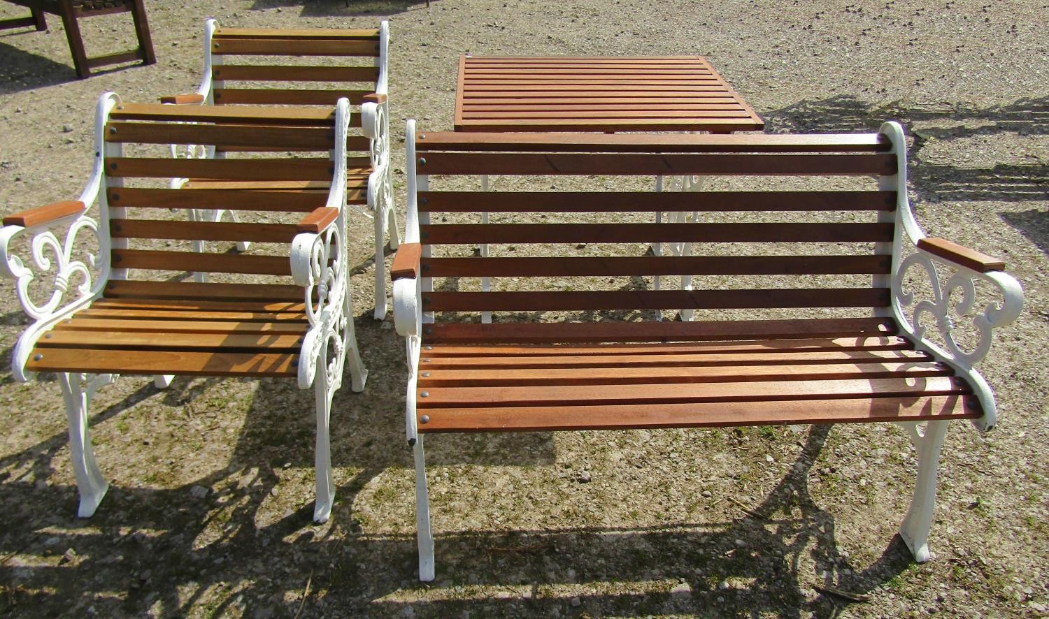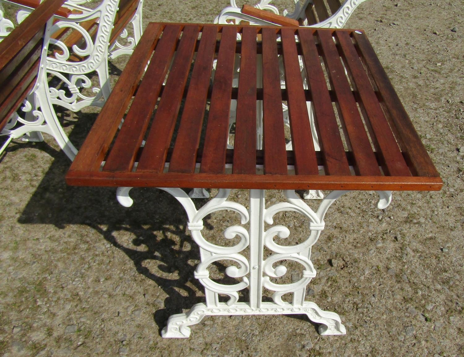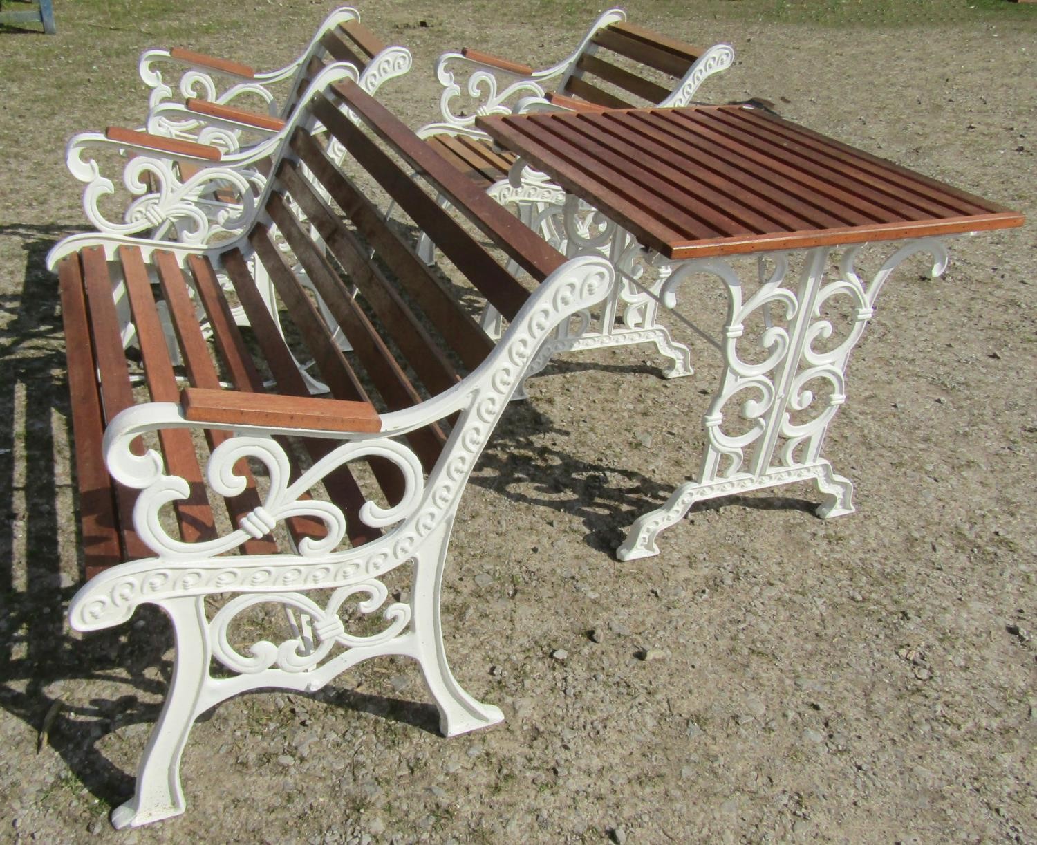 A refurbished heavy gauge four piece garden terrace set with hardwood slats and cream painted open scroll pattern cast iron supports comprising two seat bench, pair of armchairs and accompanying table