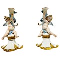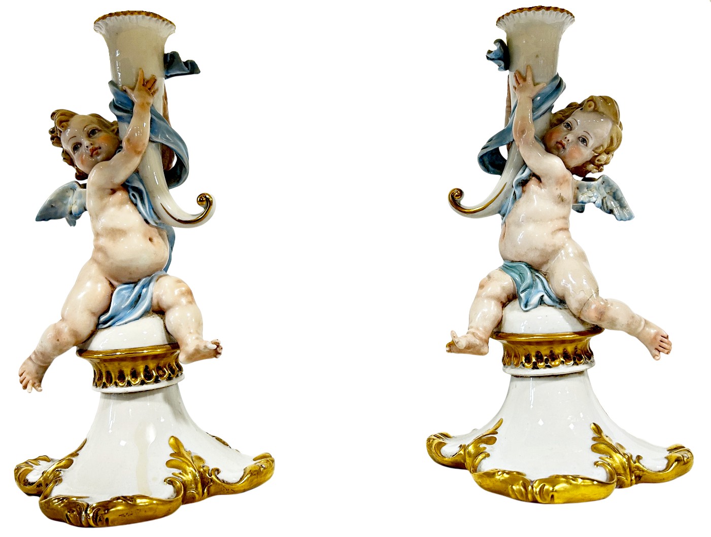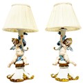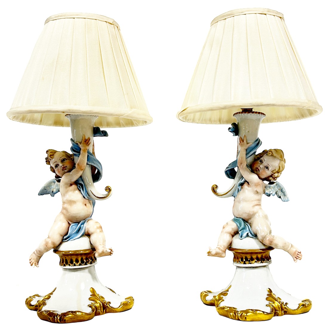 A pair of Capodimonte porcelain candlesticks in the form of cherubs holding aloft a cornucopia later converted to table lamps, 24cm high (excluding fittings and lamp shades)