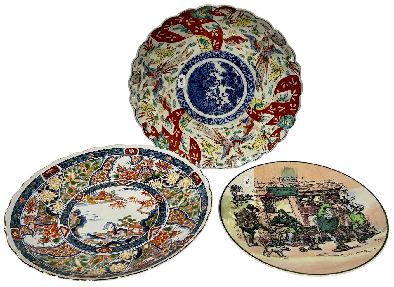 A 19th century imari dish with scalloped border and stepped base a further later example and a Royal Doulton plate - Roger Solem El Cobbler, max 32cm diameter (3)