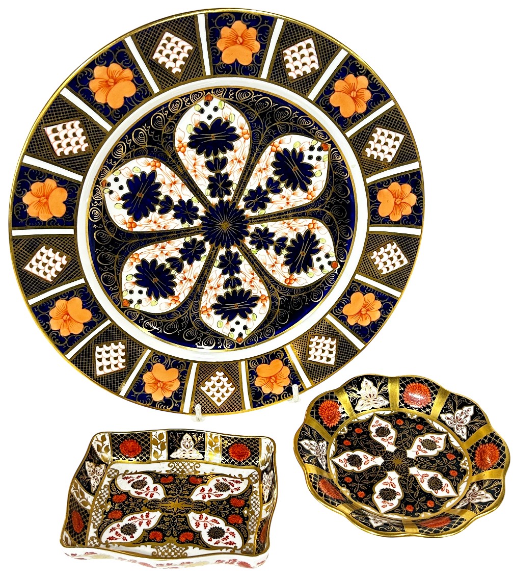 A Crown Derby imari plate 26cm diameter and two further pieces of Derby porcelain (3)
