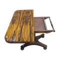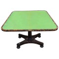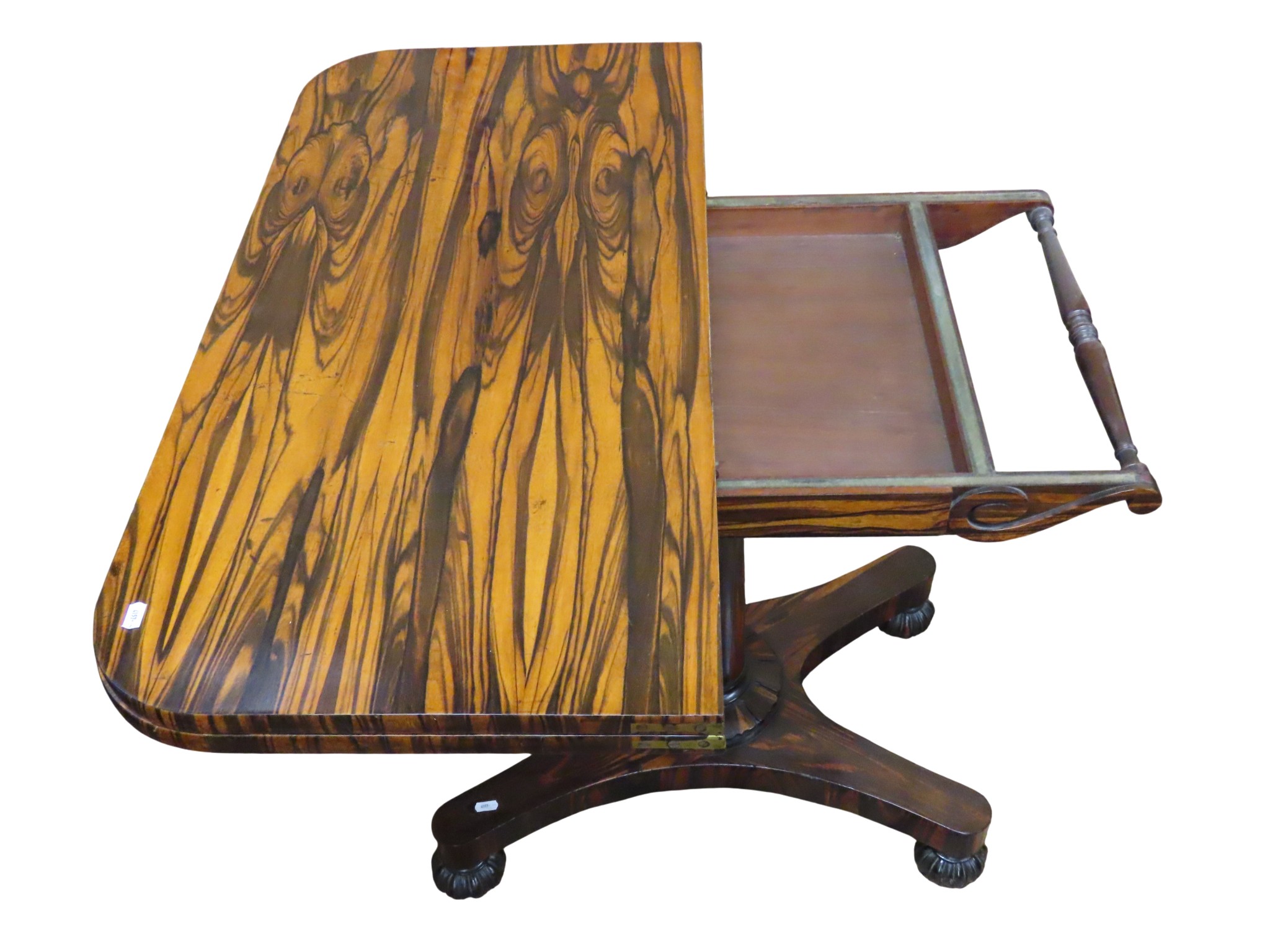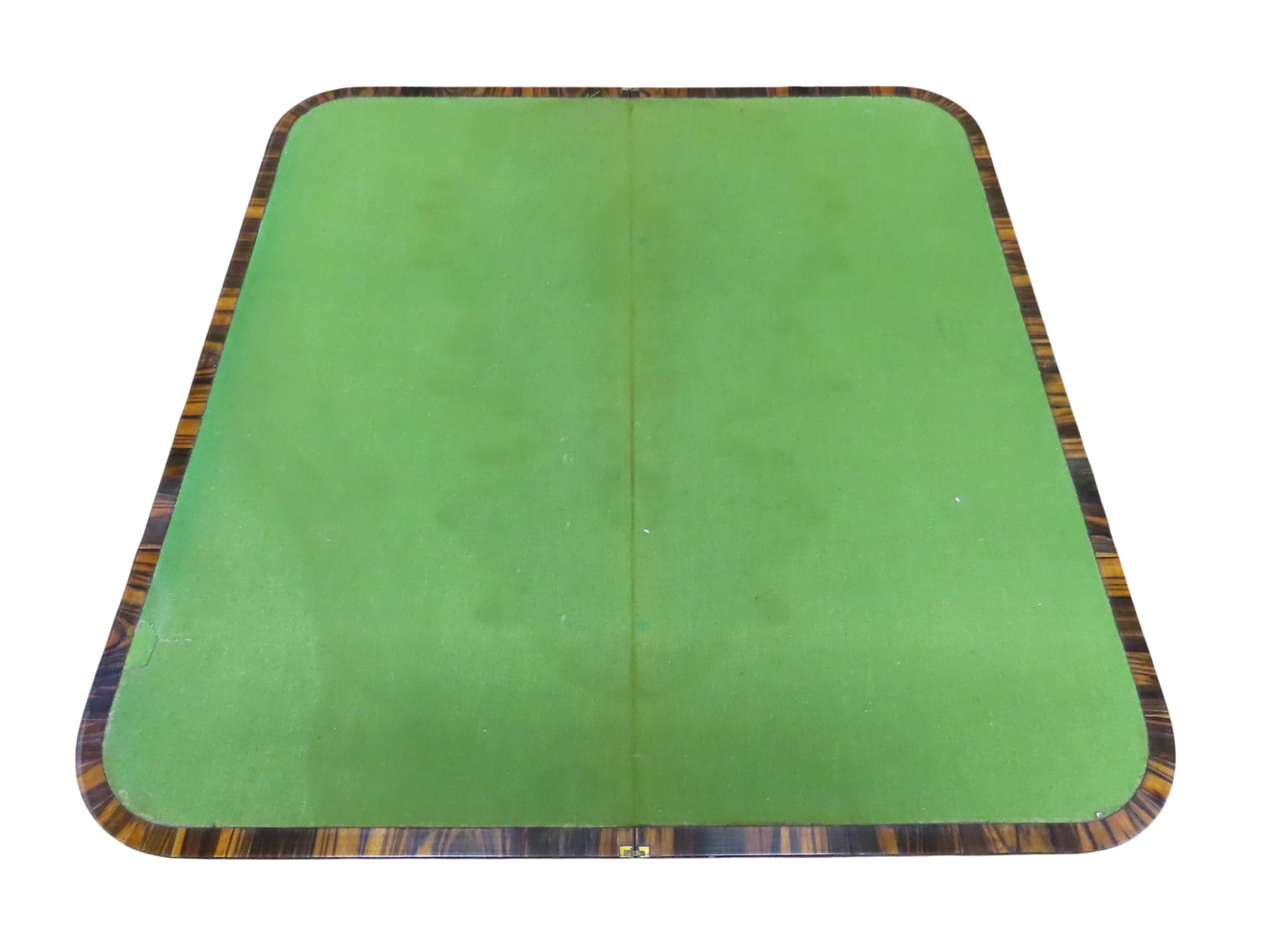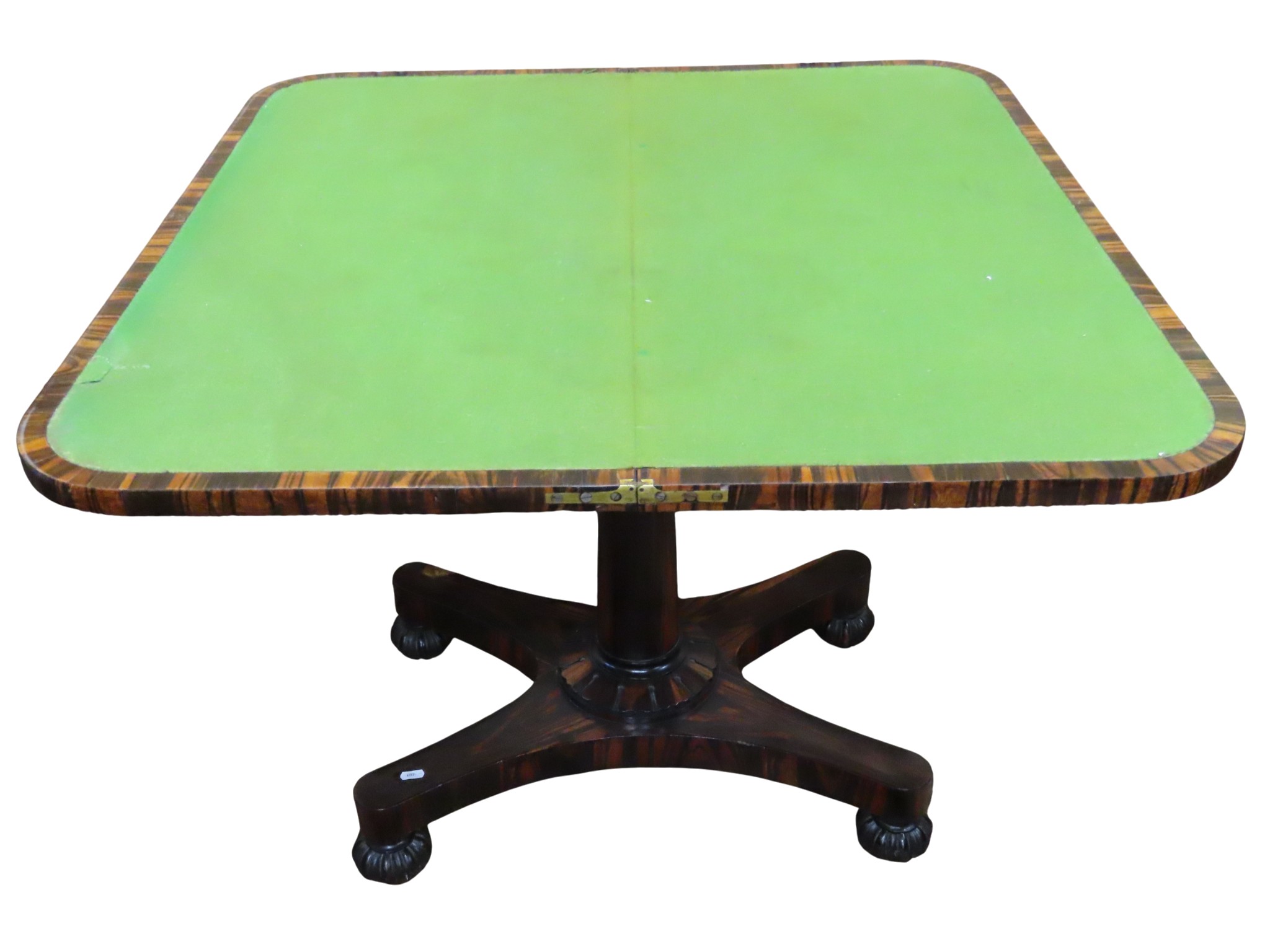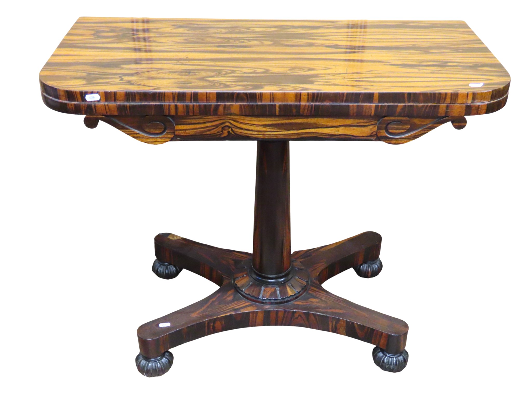 A 19th century fold over top card table, veneered in coromandel, raised on simple turned pillar with petal collar, platform and carved bun feet with integral castors, 74cm high x 92cm x 45cm (closed)