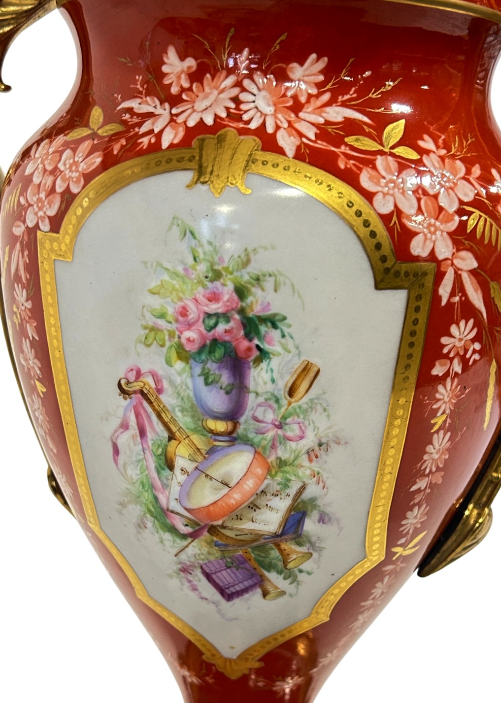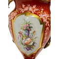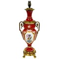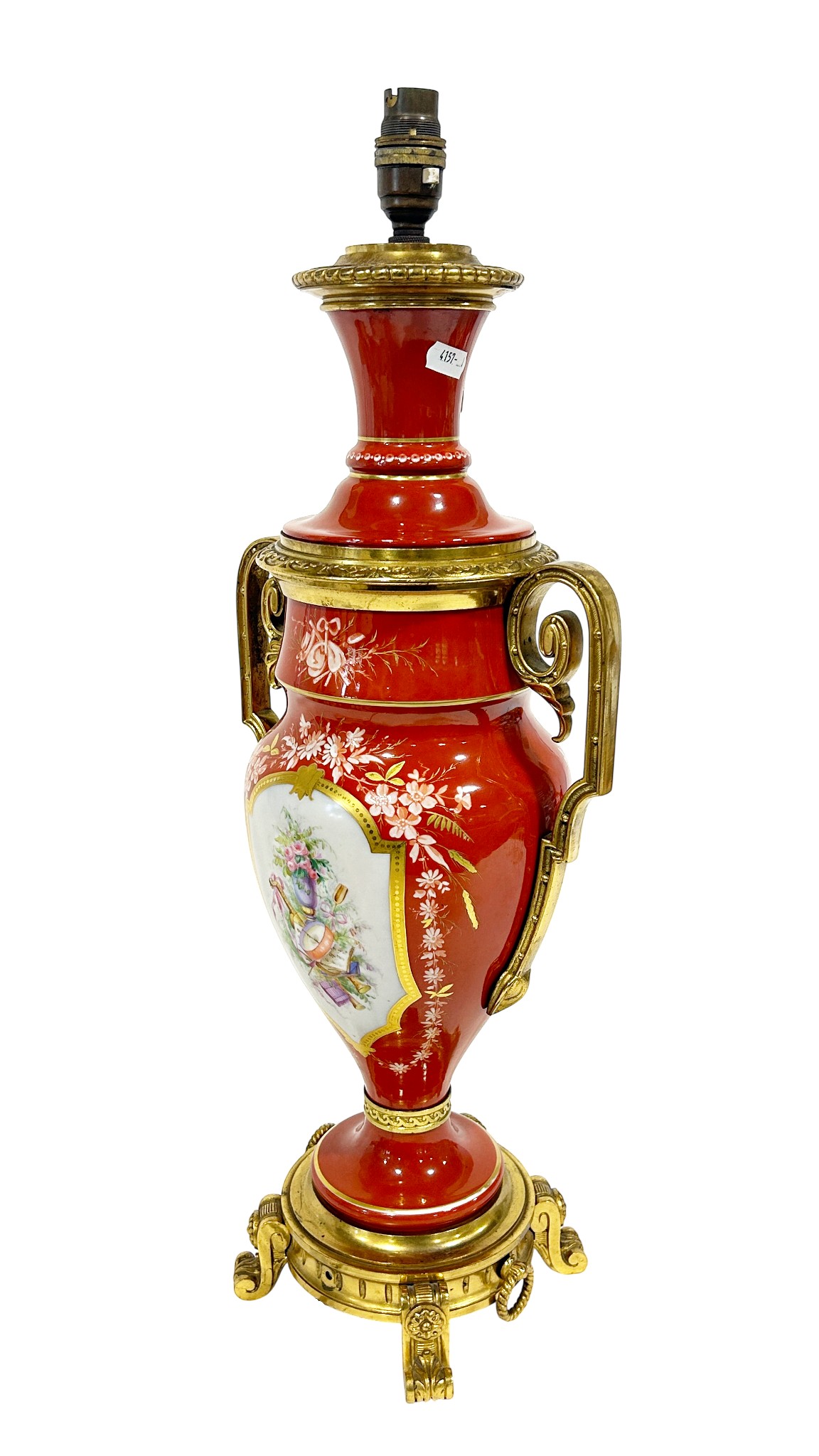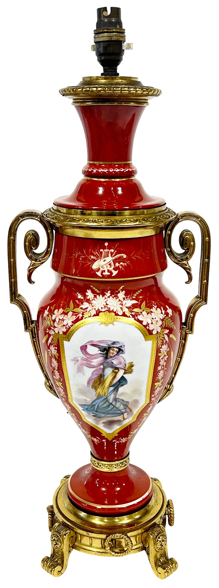 A large continental porcelain lamp base with gilt handles and base, the brick red ground enclosing floral and musical themed panel and a further panel of a harvest girl, 55cm high (excluding fittings and shade)