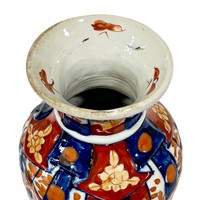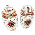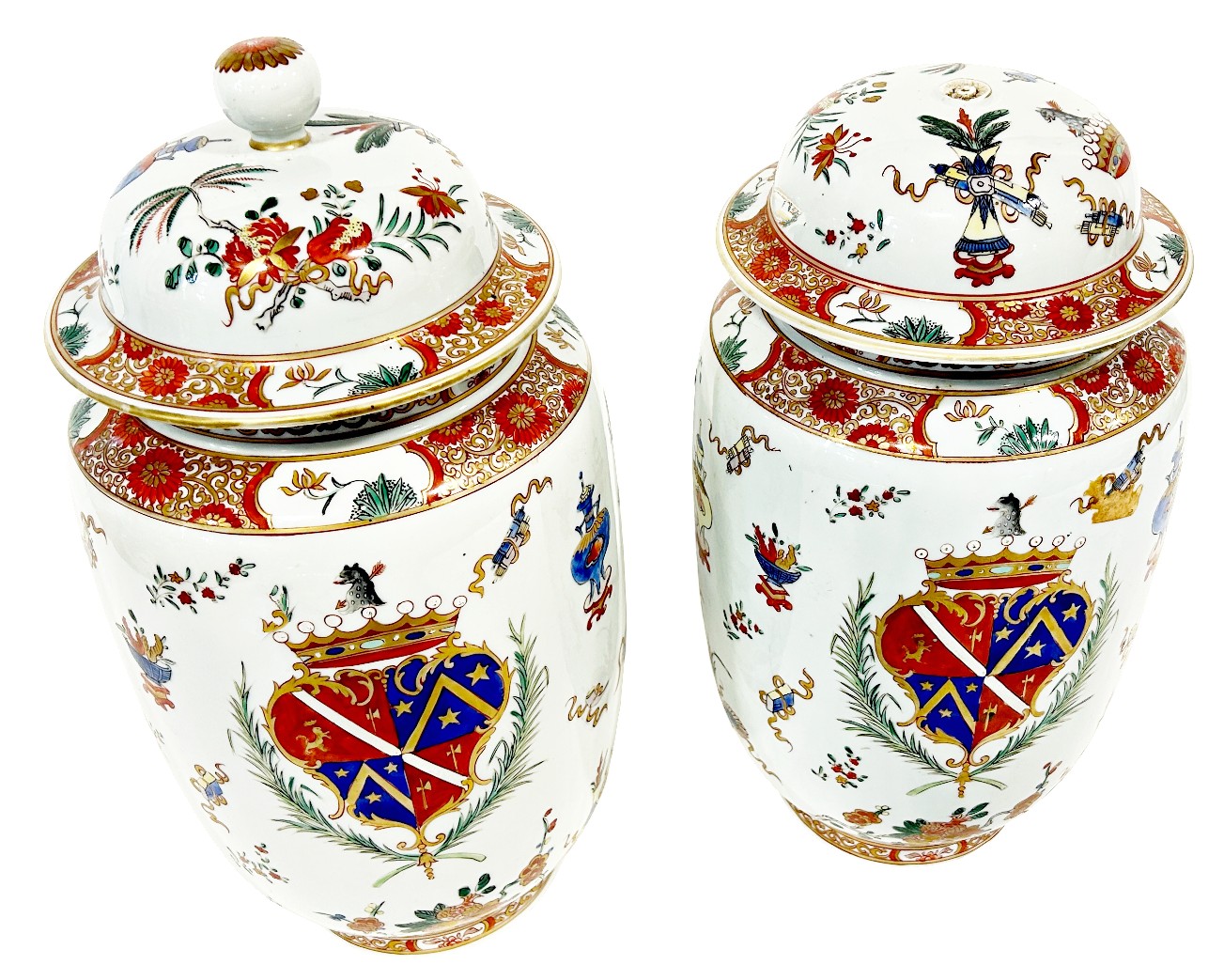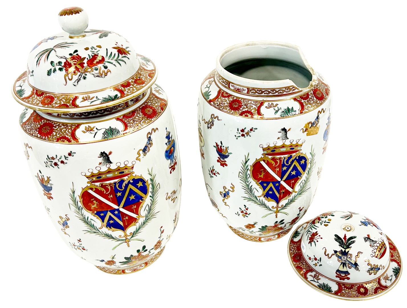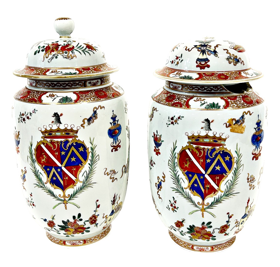 A pair of Chinese armorial vases with a central crest surrounded by auspicious symbols, height: 40 cm, one vase as found with breaks to the upper rim and cover finial (detached finial kept inside the vase) (2)